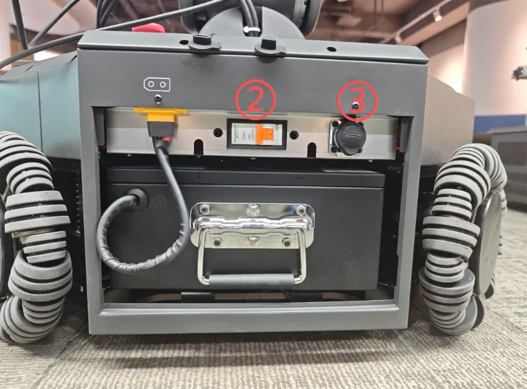 The main power switch is located at the rear of the mobile platform, as shown in the figure. The function descriptions are as follows:
