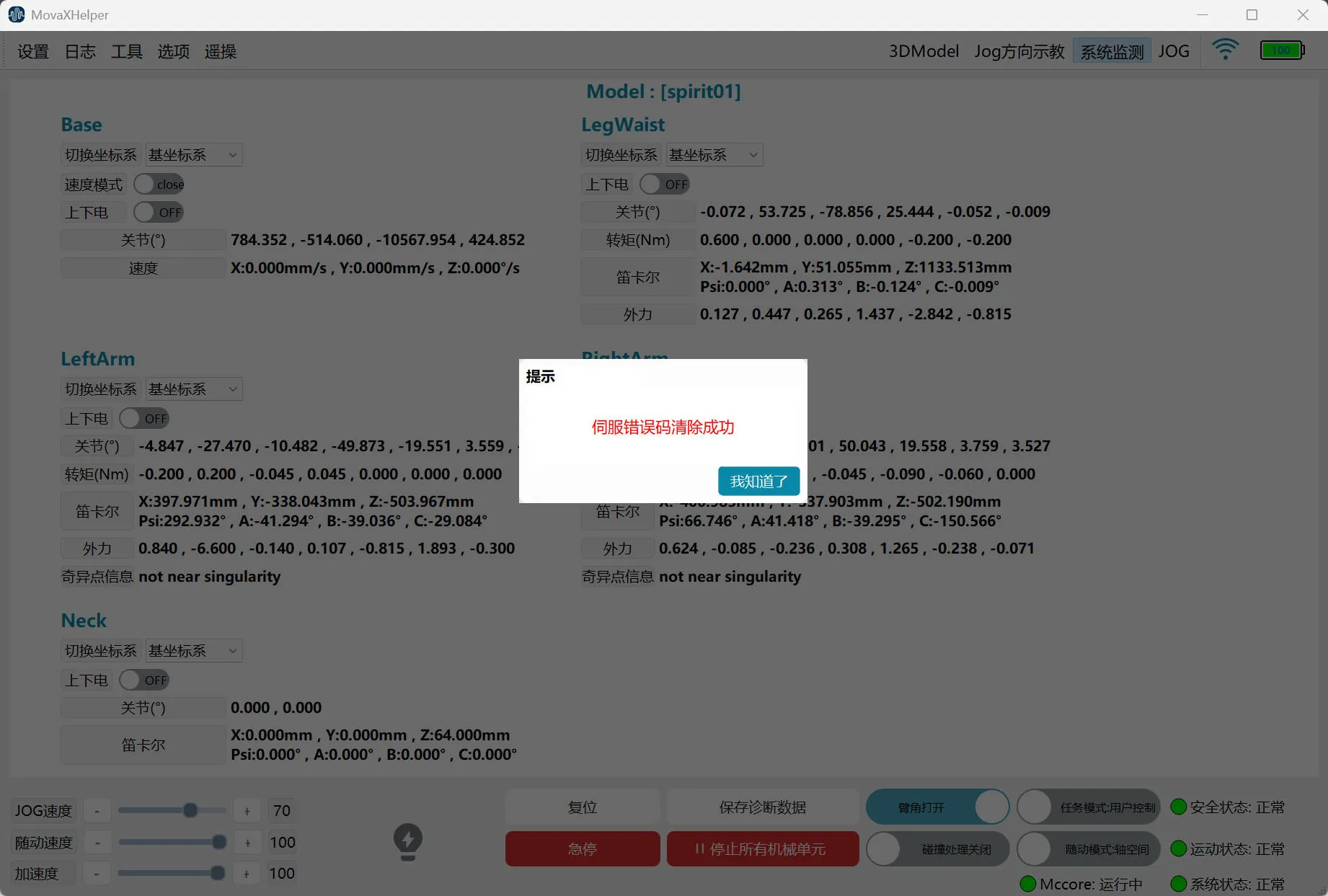 - The "Safety Status", "Motion Status", and "System Status" indicator lights in the lower right corner of the interface should be green, with status showing "Normal";