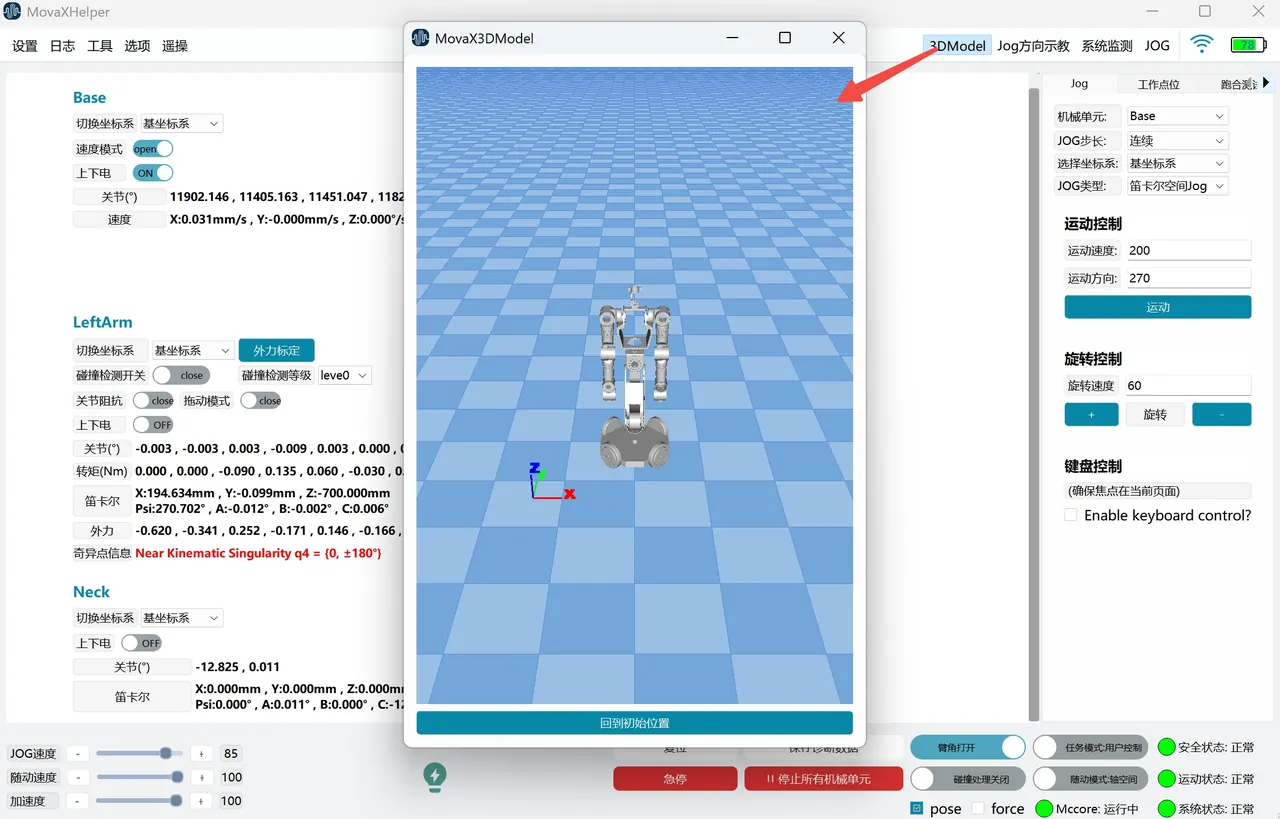 Open the floating panel through the "3DModel" in the top status bar, check whether the 3D model display posture is consistent with the robot's actual posture. If there is a large difference between the two, or if there is zero point loss, zero point calibration needs to be redone, please contact technical support.