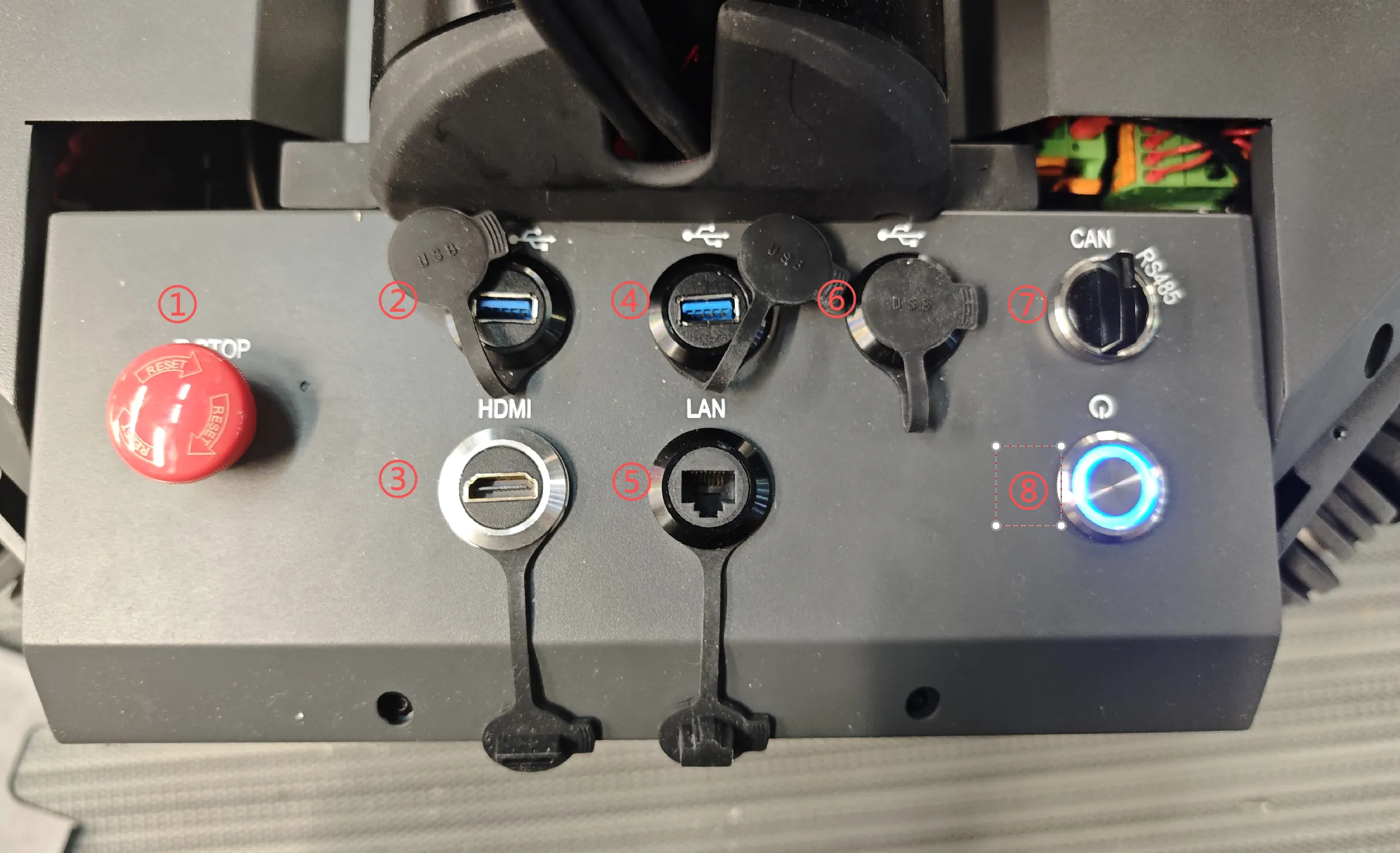 - ①Mobile Platform Emergency Stop Button: Rotary reset red mushroom head button, needs manual reset after being pressed.