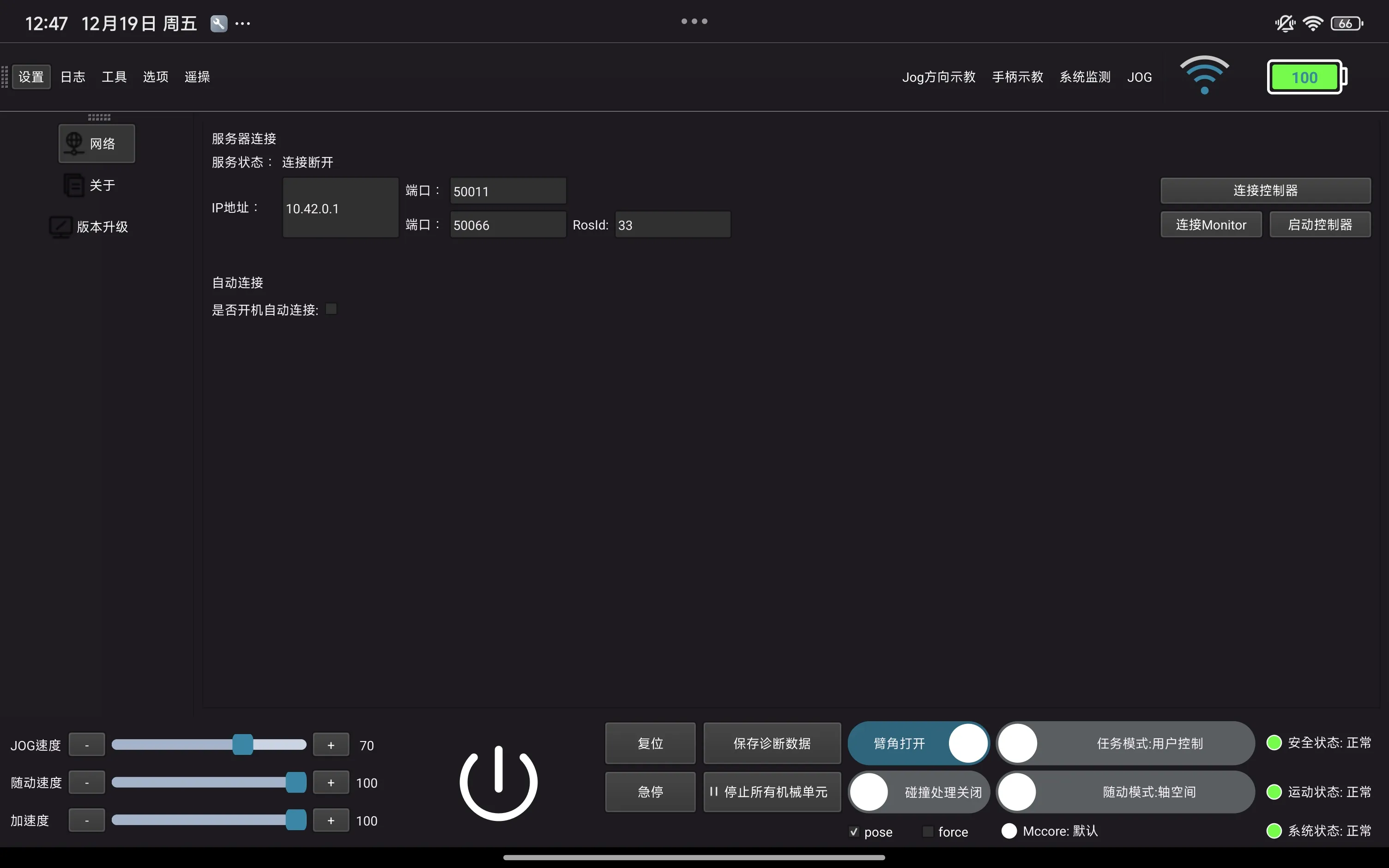 | Data Collector | 123456 | Settings: User Login, Zero Point Calibration, Parameter Settings, Peripheral Settings, Teleoperation Settings Logs: HMI Logs Tools: Set Work Points, Servo Status Options: Network, About, Version Upgrade JOG: Jog, Work Points Mechanical Units: Power On/Off, Joint Impedance |