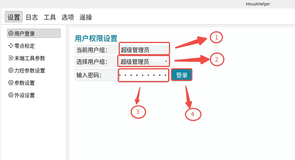 The MovaX system has four built-in user levels, from lowest to highest operation permissions: Normal User, Data Collector, Developer, and Super Administrator. After connecting to the controller, the default login is Normal User; switching to other permission users requires entering a password.