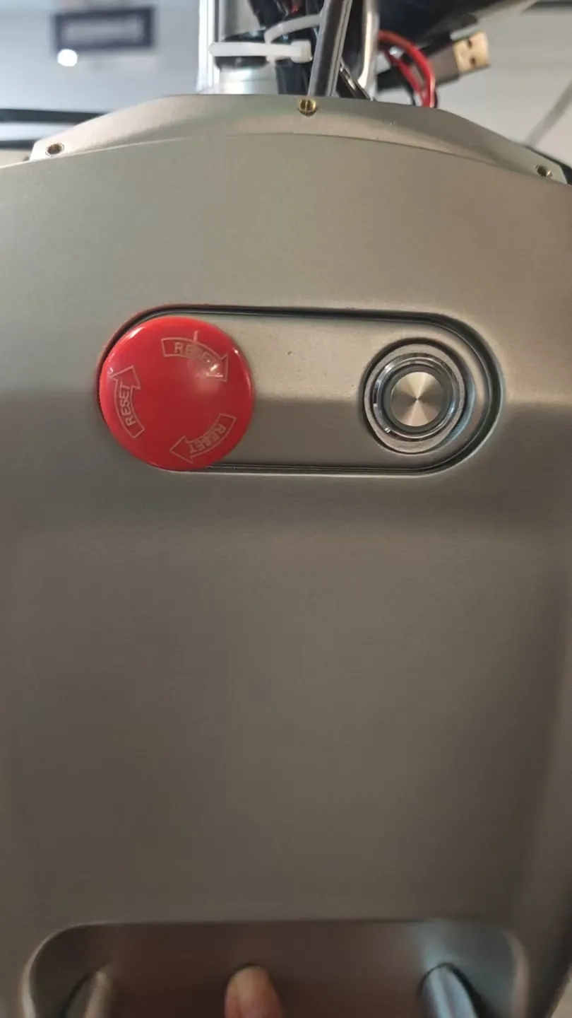The robot has three emergency stop switches, two of which are rotary reset red mushroom head buttons located at the rear of the mobile platform and on the back of the body; the other is a self-resetting handheld wireless emergency stop. The difference is that the red mushroom head button needs to be manually rotated to reset after being pressed, while the handheld emergency stop does not require this operation.
