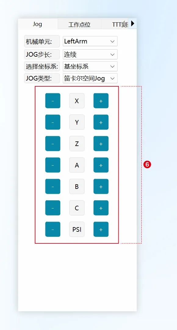 | Jog Direction Teaching | ![]() | Jog direction teaching display button, showing the "+" and "-" rotation directions of each joint to assist in Jog operation. Click to open or close the display panel. |