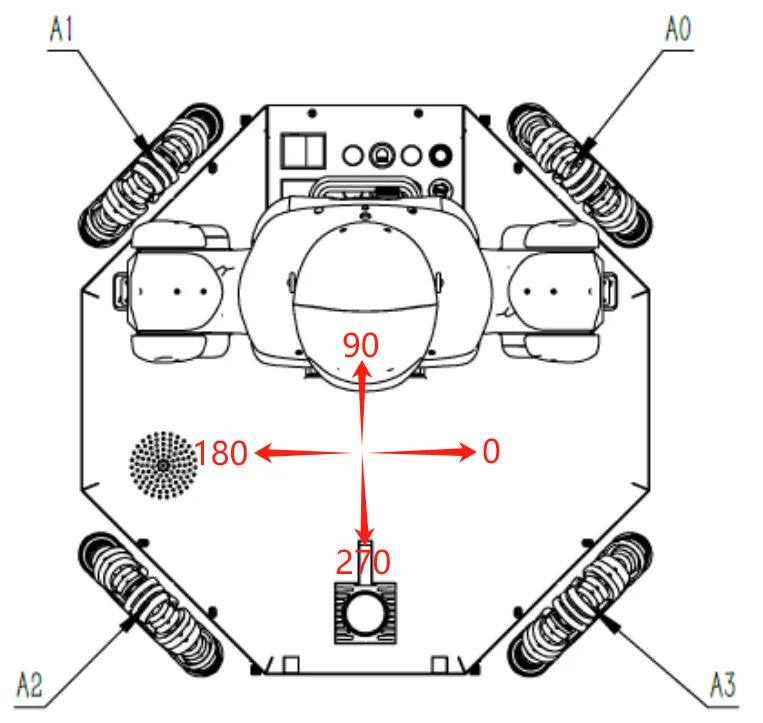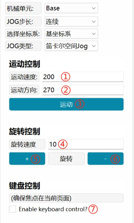 | Jog-Mobile Platform | ![]() ![]() | The mobile platform running speed rate is adjusted in "Settings-Parameter Settings", with an adjustment range of 1-100%, which is a percentage relative to the speed limits of ② and ④. Mobile platform JOG only supports Cartesian mode. Motion Control: Controls the mobile platform to run in a straight line in different directions. ① Motion Speed: Effective range 0-500, unit: mm/s ② Motion Direction: Effective range 0-360, corresponding to the motion direction as shown in the left diagram. ③ Motion: Click the button, the mobile platform starts to run, and stops when released. Rotation Control: Controls the mobile platform to rotate in "+" and "-" directions ④ Rotation Speed: Effective range 0-60, unit: °/s ⑤ +: Mobile platform rotates in the direction of "0-90-180-270-0" ⑥ -: Mobile platform rotates in the direction of "0-270-180-90-0" Keyboard Control: Use keyboard "↑""↓""←""→" keys to control mobile platform movement ⑦ Enable keyboard control?: Check this item to control the mobile platform through the keyboard: ↑: Runs in a straight line in the same direction as entered in ② ↓: Runs in a straight line in the opposite direction as entered in ② ←: Mobile platform rotates in the direction of "0-90-180-270-0" →: Mobile platform rotates in the direction of "0-270-180-90-0" When using the keyboard, the mouse focus must be kept on the current page. |