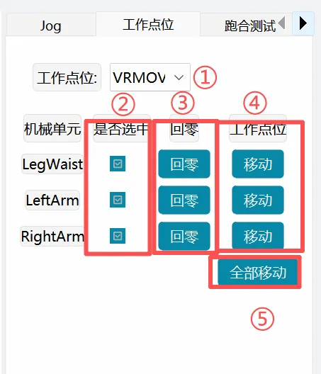 The "Work Points" usage is similar to Jog operation. Power on the mechanical unit, press the corresponding target posture "Move" button, and the mechanical unit will move to the target posture through axis space. You can also power on all mechanical units and use "Move All" to make all mechanical units move to the target posture simultaneously.