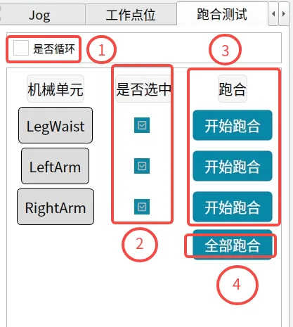 | Running-in Test | ![]() | ① Loop or Not: Check this item to run the running-in points in a loop ② Select Mechanical Unit: Select the mechanical unit to run ③ Single Mechanical Unit Run: Single mechanical unit runs ④ All TTTT: Mechanical units selected in ② run |