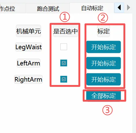 | Auto Calibration | ![]() | ① Select Mechanical Unit: Select the mechanical unit to calibrate. Dual arms and leg-waist cannot be selected simultaneously ② Single Mechanical Unit Calibration: Single mechanical unit calibration ③ Calibrate All: Calibrate mechanical units selected in ①. Dual arms and leg-waist cannot be selected simultaneously |
