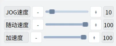 | ① | ![]() | Running speed adjustment control, used to adjust the running speed of dual arms and leg-waist. Adjustable range is 1%~100%. JOG speed and following speed independently affect the running speed of user control and external control modes respectively. Acceleration is common to both modes. Click the slider or -/+ buttons to fine-tune the program speed (-/+1%). |