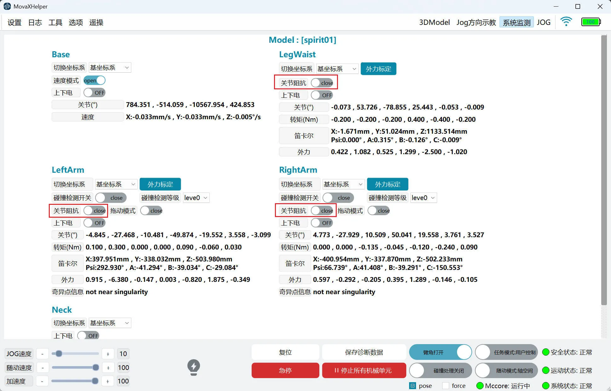 The joint impedance function is enabled on the "System Monitoring" page. When enabling, the mechanical unit must be in a powered-off state. The function takes effect after powering on.