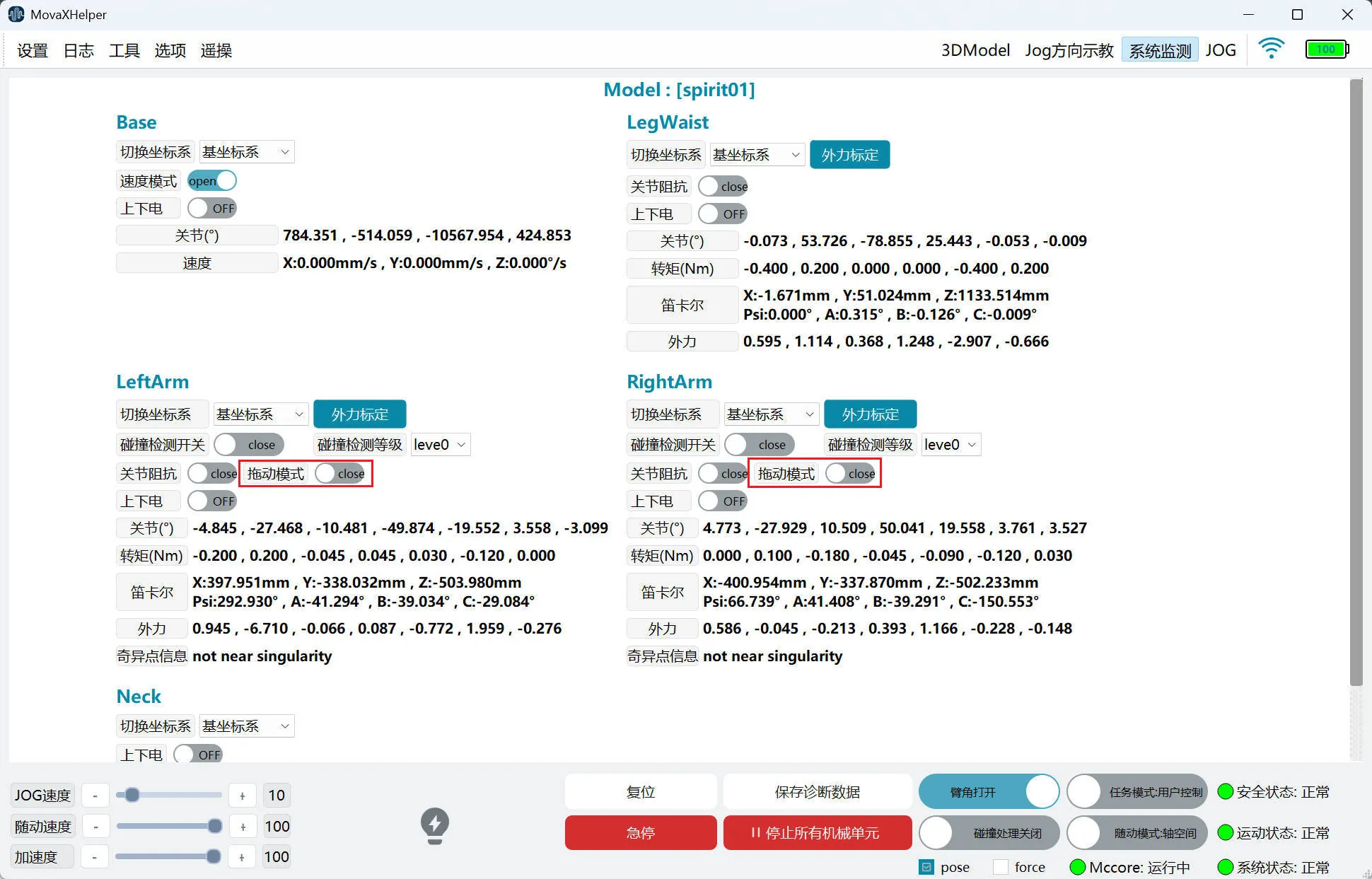 Drag mode is enabled on the "System Monitoring" page. When enabling, the mechanical unit must be in a powered-off state. The function takes effect after powering on.