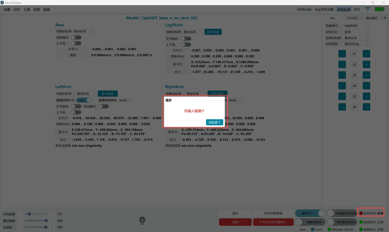 - "pose" mode: In this mode, use manual Jog to move the collided mechanical unit to a safe area;