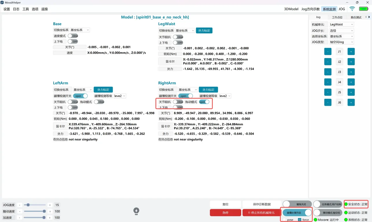 - Turn off the "Collision Handling Enable" switch. The "Safety Status" indicator is green and displays "Normal", indicating that the collision state has been cleared. If "pose" mode is selected, after enabling the switch, power on directly, and Jog the mechanical unit to a safe area. There is no need to turn on "Drag Mode".
