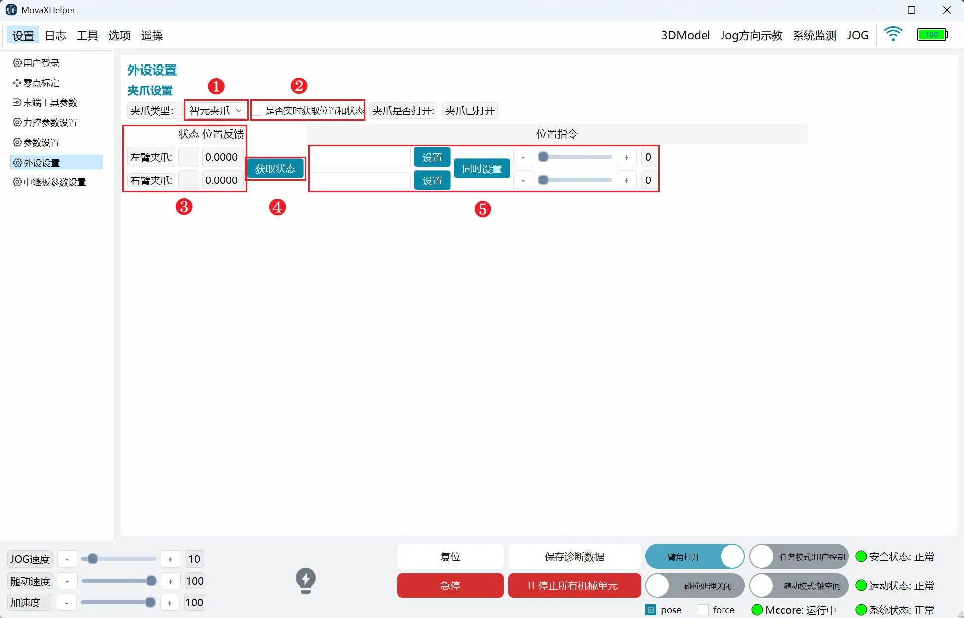 "Peripheral Settings" is used to adjust the opening and closing size of the two fingers at the end of the left and right arm grippers.