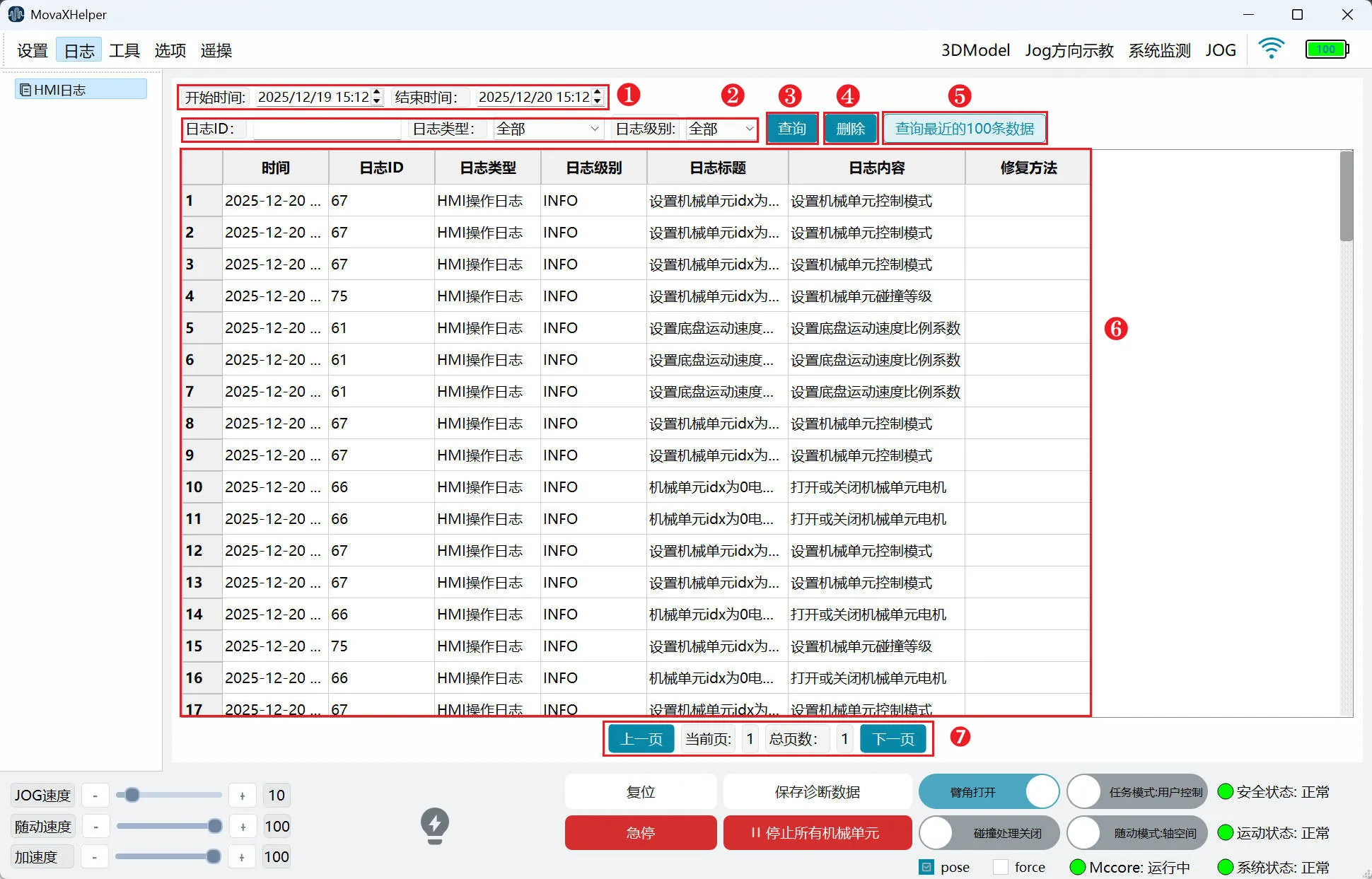 - ⑥ Log Information Display: Log information display, each page displays 100 items, browse by dragging the left slider;