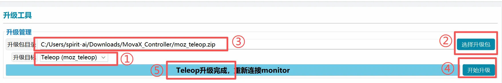 - Click Start Upgrade, wait for the upgrade to complete, restart the moz_teleop program