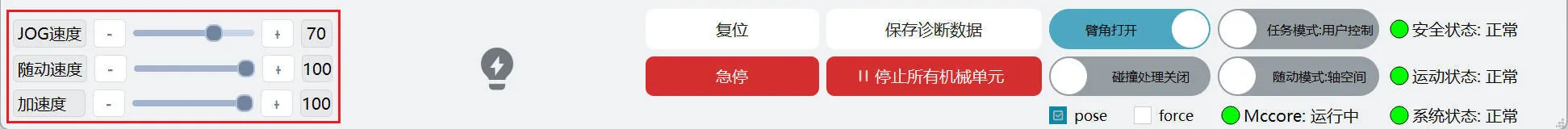 | System Monitoring | ![]() | System monitoring entry button, displaying the current power status, posture, force, and other states of the robot in real time. Click to open or close the control panel. |