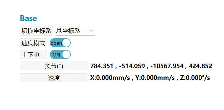 | ② | Switch Coordinate System: You can choose base coordinate system or mobile platform base coordinate system. The Cartesian readings in ⑥ will change accordingly. |