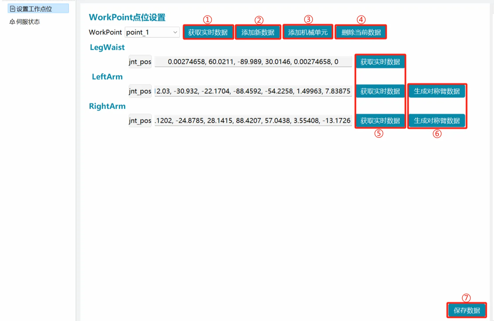 - ① Get Real-time Data: Get the current angle values of all mechanical units and update to the selected point.