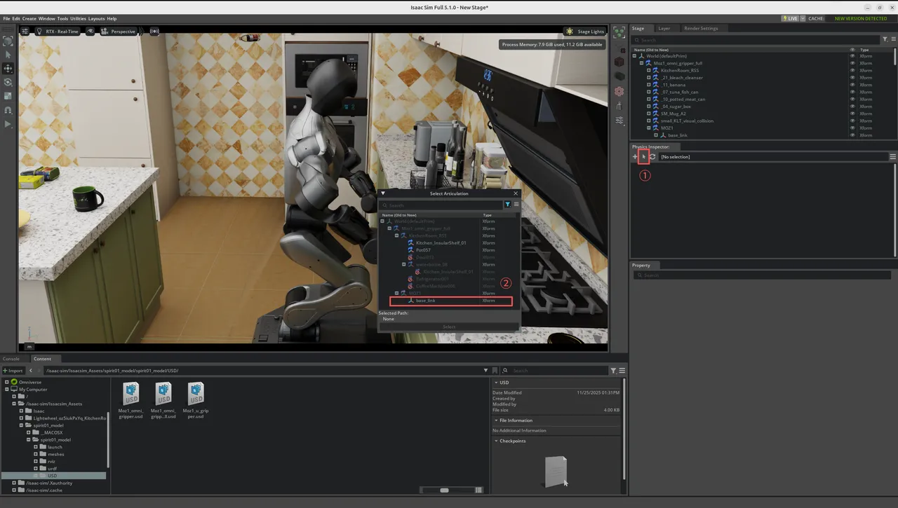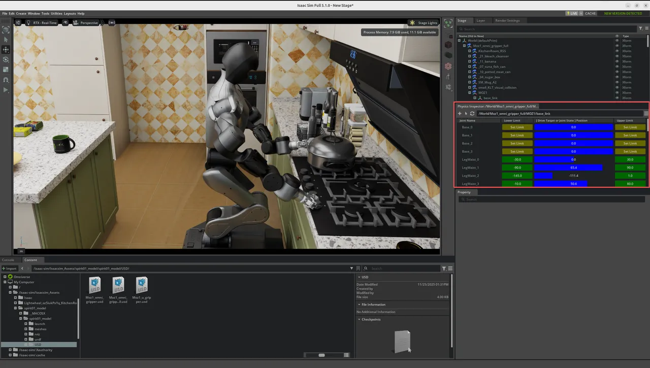 In the assets section, find the corresponding asset according to the path Issacsim_Assets/spirit01_model/spirit01_model/USD/Moz1_* (container internal path), then drag it into the middle Stage section,