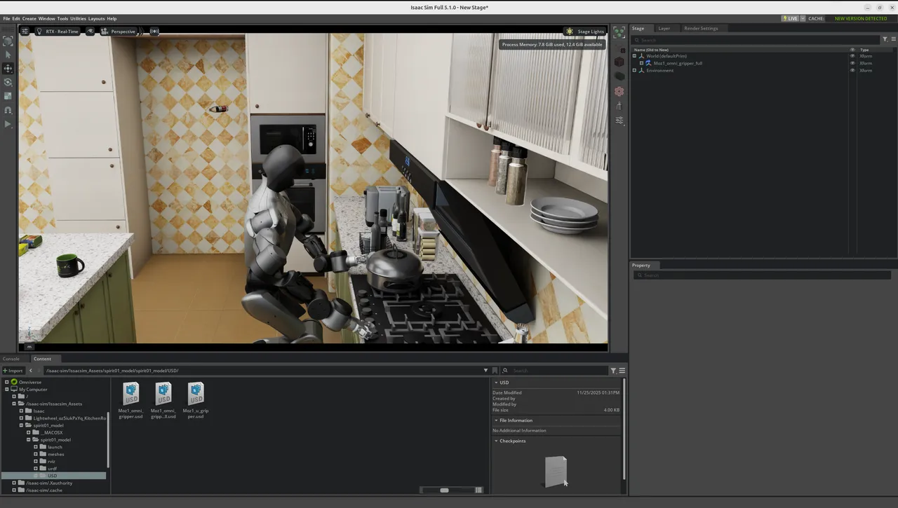 └── ...This version of simulation only includes Kitchen-related scenes and their supporting assets. If other environments are needed, please build them yourself according to project requirements. Moz1's end effector comes pre-installed with a gripper: OmniGripper, which can be directly used for simulation and testing of related tasks.