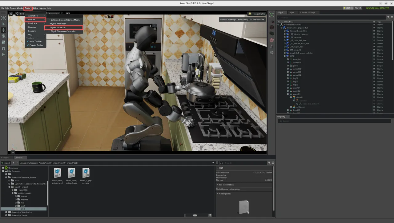 To visually adjust the robot joint angles, you can open the physics property editor through the menu Tool → Physics → Physics Inspector, as shown below.