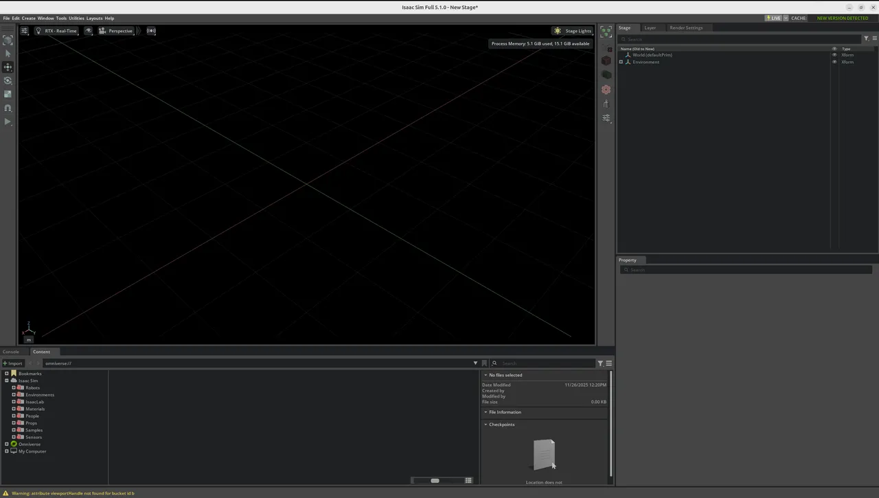 ./isaac-sim.shThe first loading takes a long time (please wait patiently, do not click "Force Quit"). After successful loading, the following screen appears: