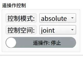 The switch status bar section consists of three buttons, controlling left arm power on/off, right arm power on/off, and following status respectively. Following needs to be enabled for teleoperation; following is not recommended for inference (safety consideration); at other times it is recommended to turn off all three switches to prevent accidental teleoperation controller touches.